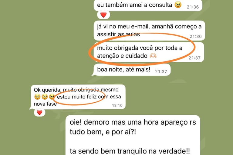 Esse acompanhamento dá espaço para observarmos seus avanços, lidarmos com possíveis desafios e garantirmos que cada etapa seja adaptada à sua realidade. Além disso, você terá suporte via WhatsApp durante todo o período, para não precisar esperar até a próxima consulta para tirar dúvidas ou pedir orientações.