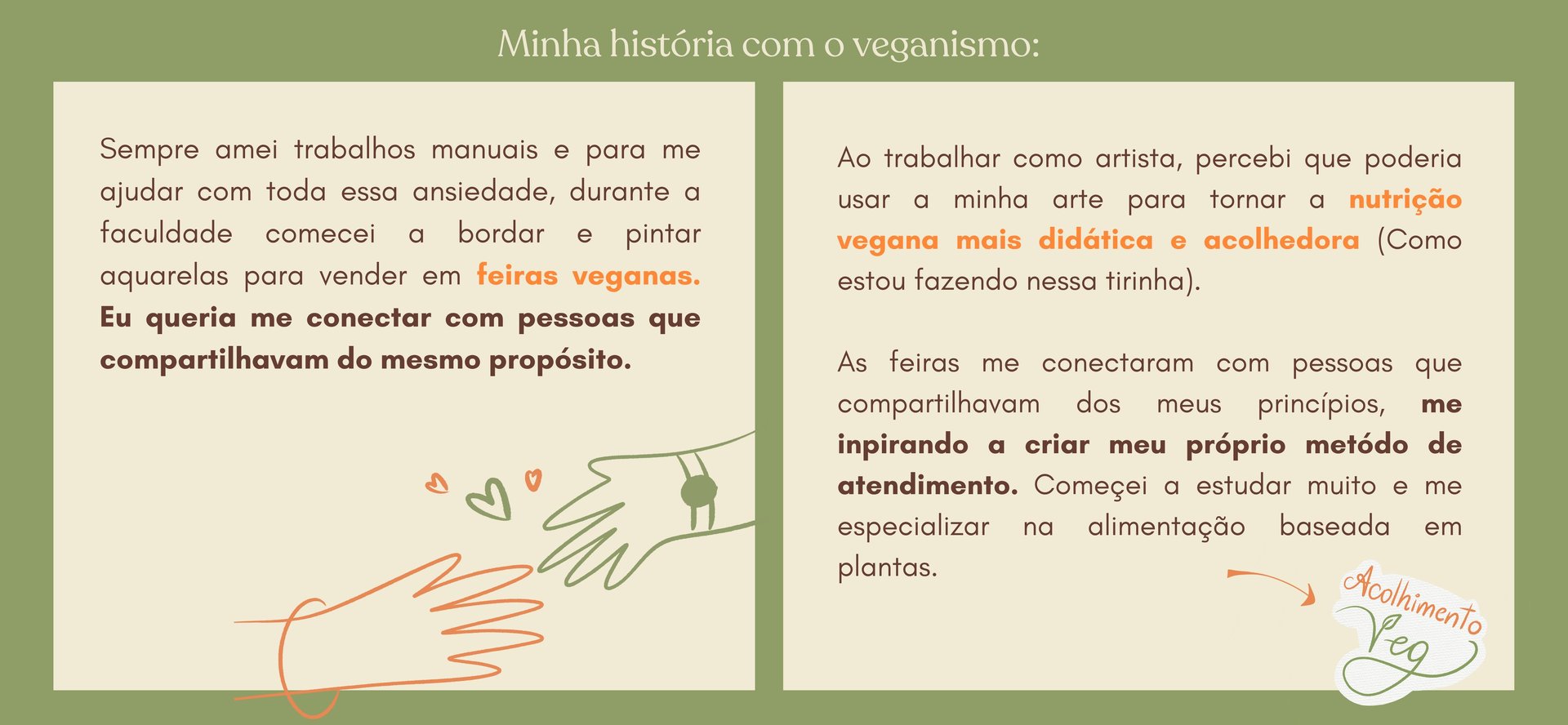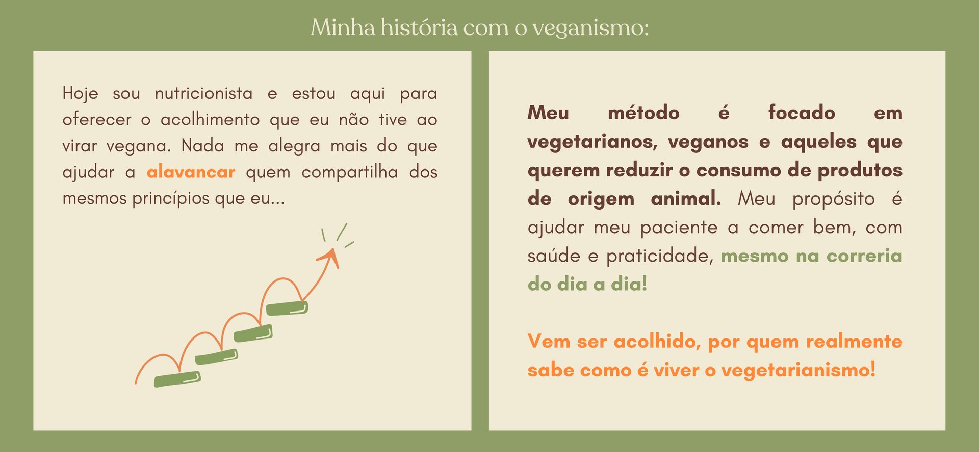 "Acredito no poder do acolhimento como parte essencial do cuidado nutricional. E por viver o vegetarianismo na pele, compreendo de verdade os desafios dessa jornada: desde a falta de tempo até a insegurança nas escolhas alimentares ou a dúvida na hora de montar um prato. Por isso, trago um olhar sensível, realista e experiente, com estratégias acessíveis, receitas práticas e suporte próximo."